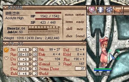というわけで、残りは武器と頭。武器は元ギルメンがロッドを精錬している最中に、何となく倉庫にあった+2聖書を精錬してみたら+7になっちゃったので(?)、これにオットー2枚刺しでいいと思います。MEで使う際はDex鯖杖に刺そうかと思ってるので、共有できるとは思ってませんしね。